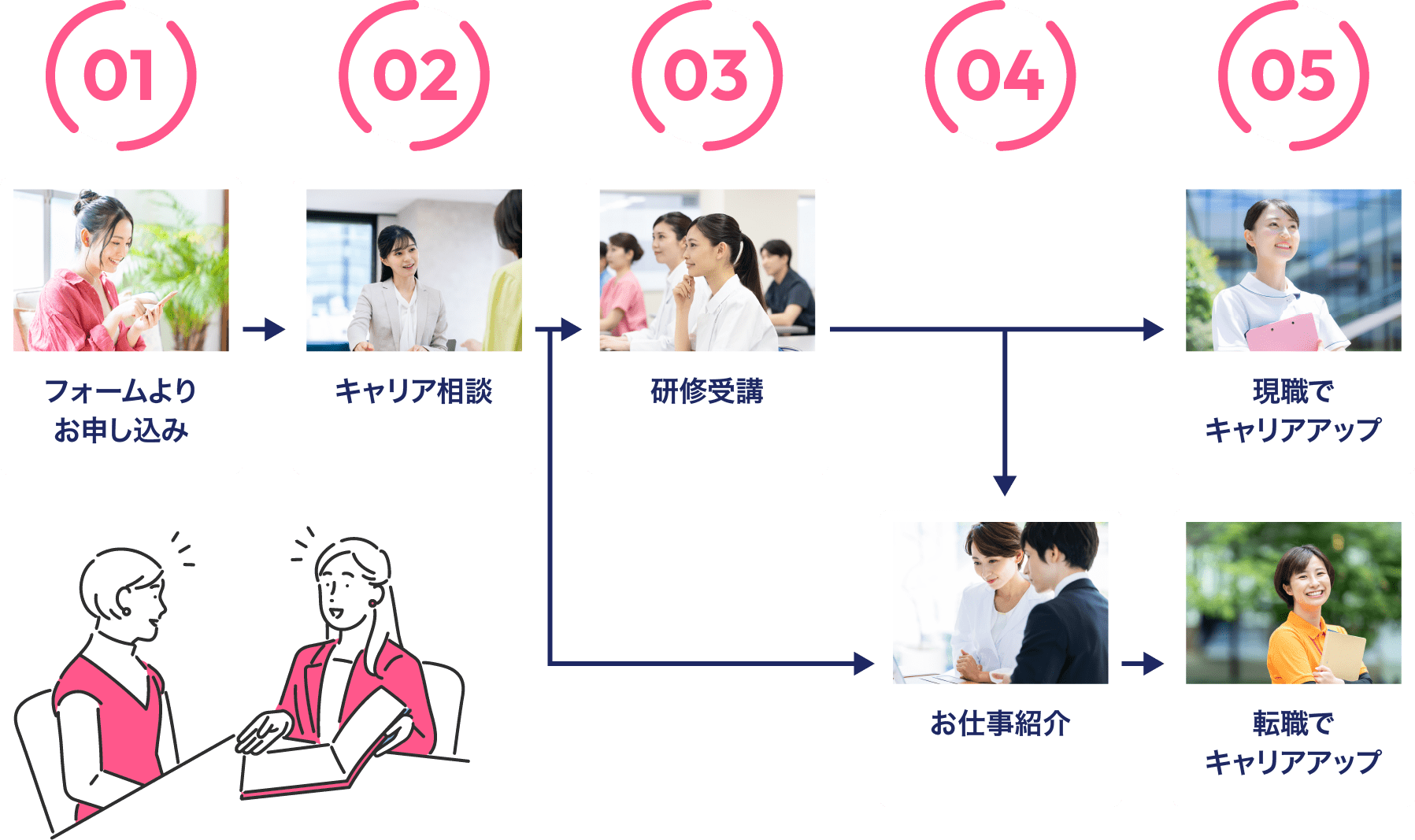 キャリア相談だけでなく、研修コンテンツの受講も無料でご利用いただけます。費用は一切発生しませんので、ご安心ください。